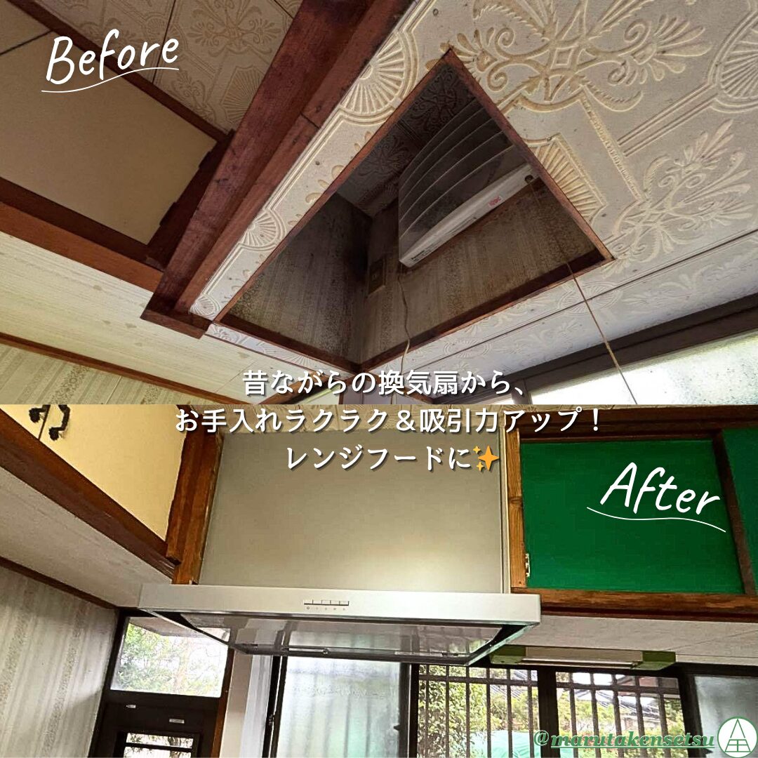 古くなっていた換気扇は、吸引力が高くお手入れのしやすいレンジフードへ交換し、日々の掃除の負担を軽減。
